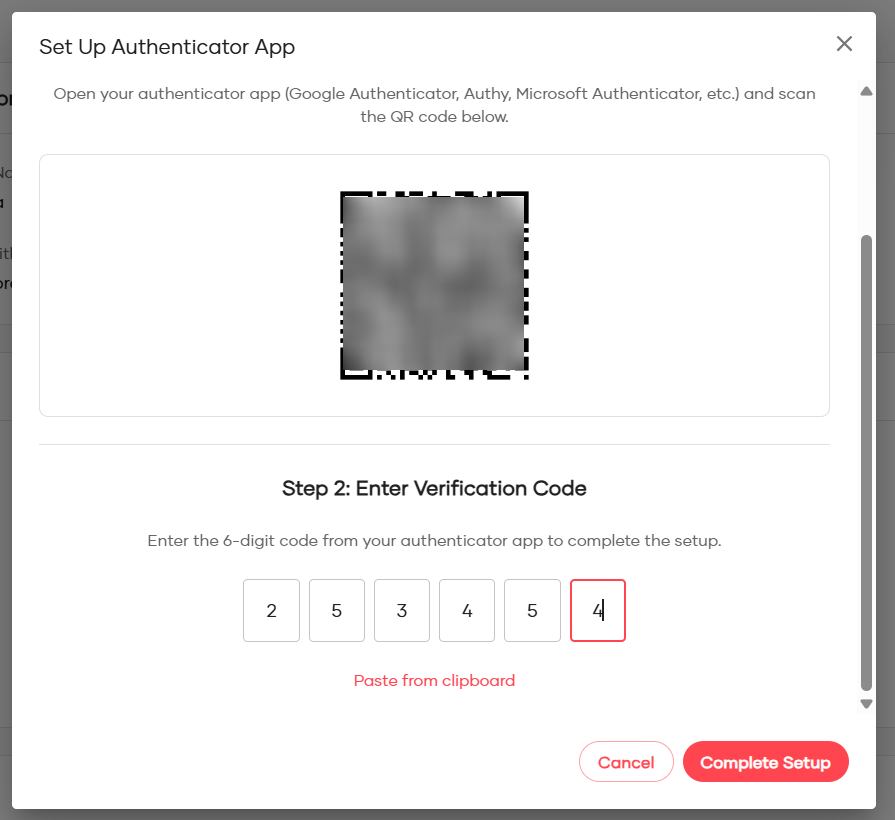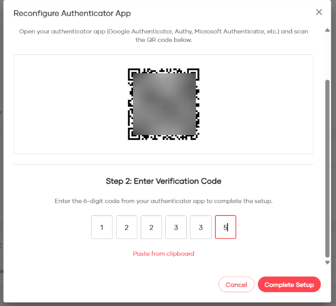 Enter the 6-digit code from the new device and click Complete Setup